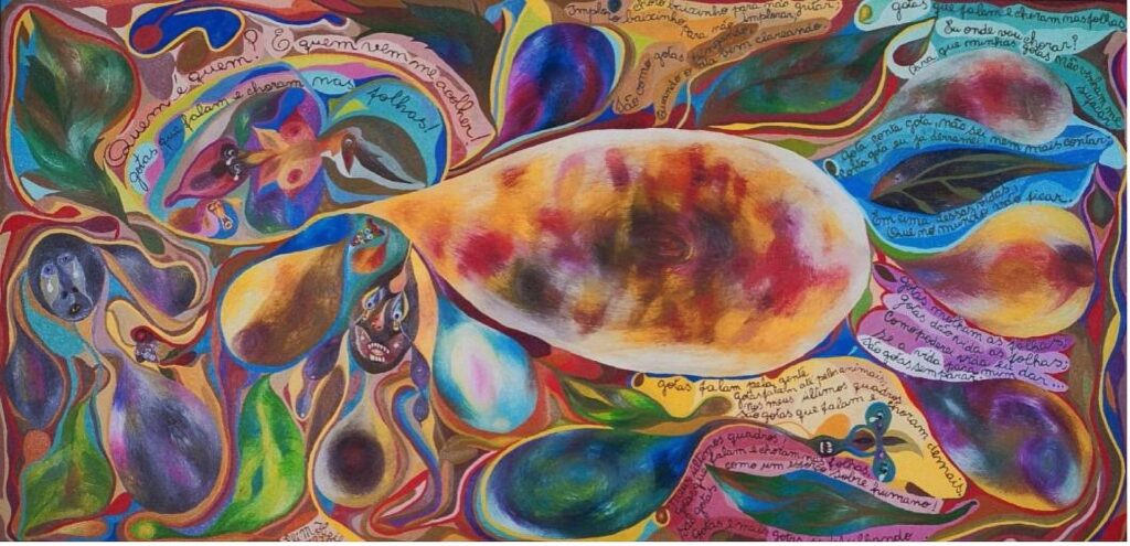 De longe um caos, de perto um segredo. Vista de longe, parece uma combinação cromática confusa. Mais de perto, as formas desconhecidas se tornam surpreendentes alusões vegetais como sementes, bulbos, botões de flores, folhas, frutos; partes orgânicas como olhos, seios com ou sem mamilos, testículos; seres microscópicos ou figurações oníricas como espermas, óvulos, gotas, lágrimas e balões. Tudo isso pode ser reconhecido na colorida composição que parece tanto mover-se no espaço, como num ambiente líquido (figura 1). Chama atenção o fato de que as inscrições ampliam os elementos ornamentais e preenchem os vãos, formando uma espécie de dança visual executada pelas flâmulas, onde balançam melancólicos poemas com frases curtas e repetidas, enquanto as formas ovóides predominam.