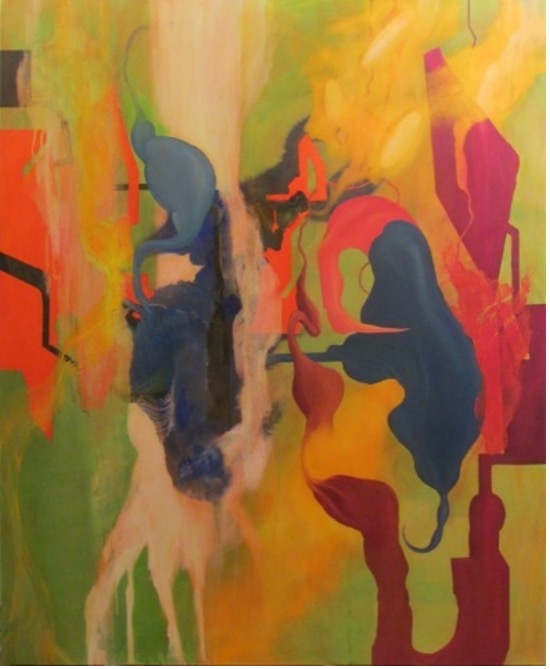 Entre as pinturas da exposição O ASTRONAUTA, encontra-se uma tela sem título, sobre fundo verde com veladuras escorregadias e nebulosas em amarelo. Nada favorece a identificação das estruturas ambíguas, situadas a meio caminho entre o orgânico e o maquínico, o razoável e o residual. Órgãos corporais como rim, fígado e/ ou pulmão se confundem com engrenagens curvilíneas e tubulações angulares. Dividida em quatro partes no sentido vertical, uma cenografia das formas se desenrola mais entre a segunda e a terceira parte, onde um sistema flutuante e enigmático é apresentado em planos distintos, sendo que os principais elementos possuem cores nuançadas em azul e vermelho, complementadas pela mancha alaranjada e pelos componentes em preto.