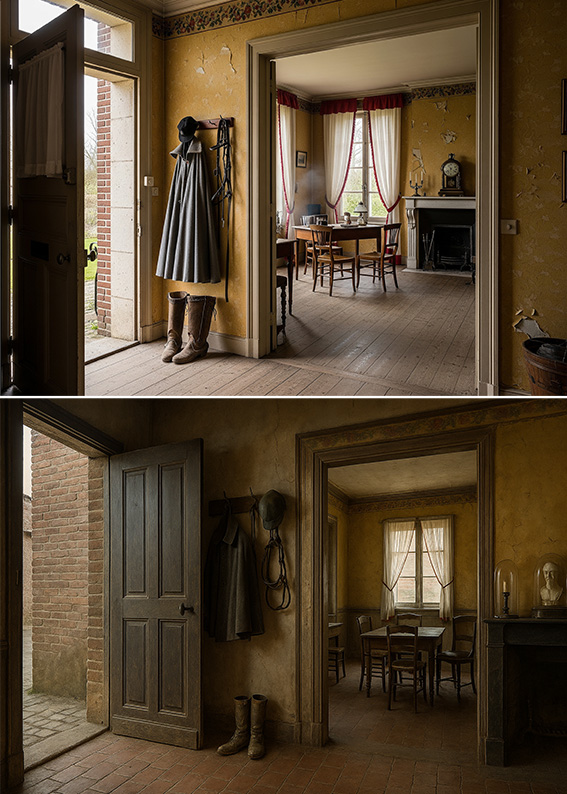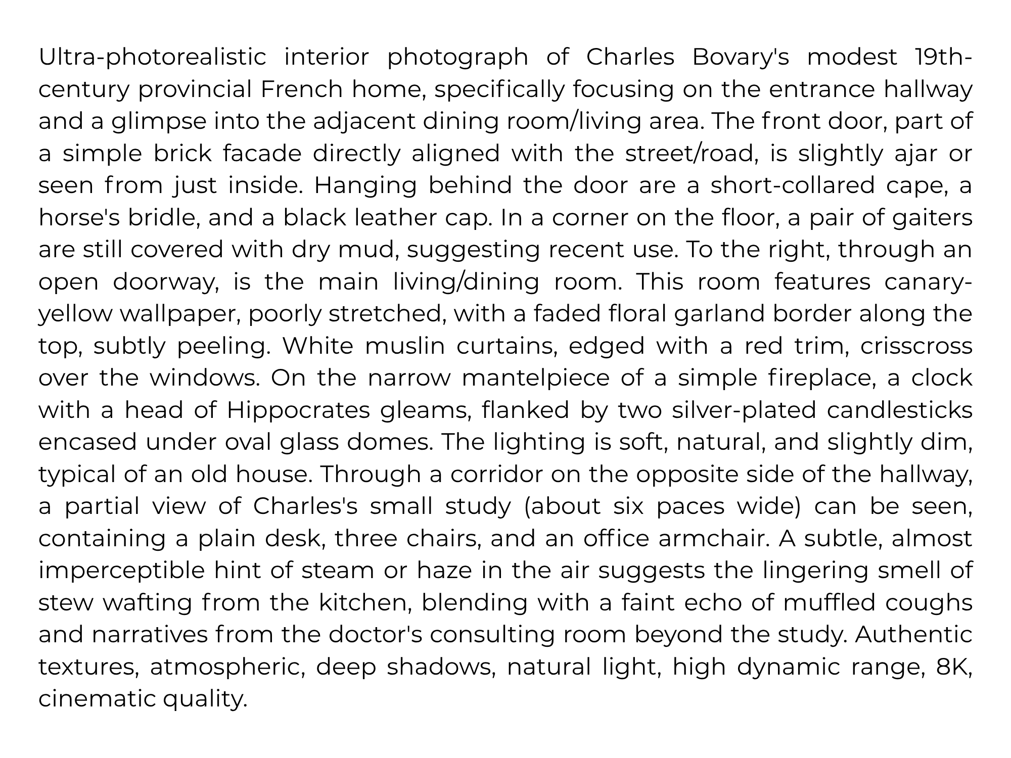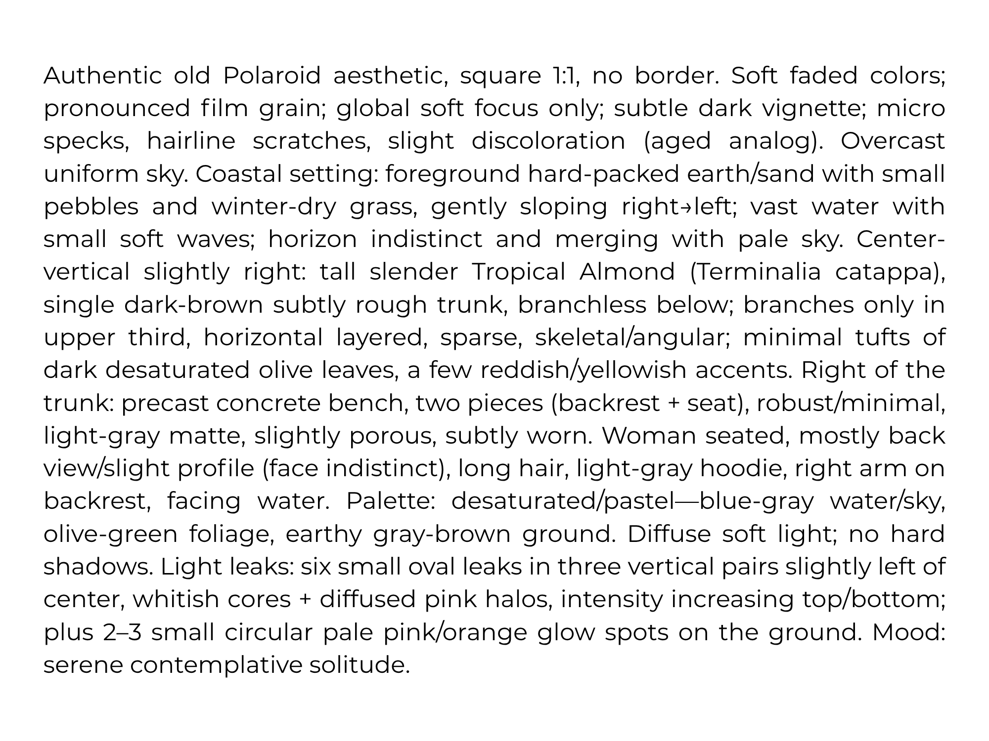 A série VerDizer parte de um impasse clássico: ver e dizer não pertencem à mesma dimensão. A imagem resiste à captura total pela linguagem; toda formulação verbal é sempre contorno, aproximação. No entanto, as tecnologias mais recentes vêm nos obrigando a inverter o movimento: para produzir imagens com inteligência artificial, passamos a dizer antes de ver—a redigir instruções (prompts) que tentam domesticar o indizível. A série investiga essa fricção por meio de dois conjuntos. No primeiro, uma Polaroid analógica é analisada por IA, que redige um prompt; dele emerge uma nova imagem gerada por máquina. Embora aparentadas, Polaroid e output não coincidem: o grão, a luz, o acaso químico e o tempo do gesto fotográfico tornam-se irredutíveis ao cálculo do modelo de geração de imagem. No segundo, um trecho descritivo do romance Madame Bovary é convertido em prompt e executado por dois modelos distintos de geração: o mesmo texto produz duas imagens diferentes, evidenciando que a linguagem, longe de garantir equivalência, não alcança a totalidade da imagem. Como lembra Blanchot, falar não é ver; a série encena esse intervalo irredutível, onde a imagem nos escapa justamente quando a dizemos.