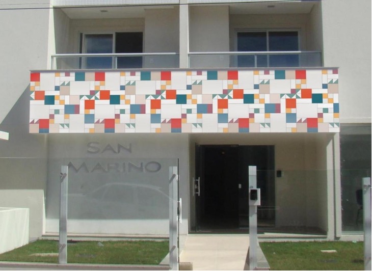 Quem passar pelo Residencial San Marino, localizado à rua Egídio Manoel Schmitz, número 28, num bairro de Florianópolis chamado Bela Vista, verá que os moradores dos apartamentos com dois ou três dormitórios, em sua maioria financiados, possuem um diferencial em relação a outros prédios de seu padrão: uma fachada assinada pela artista Cassia Aresta (Florianópolis, 1956). Trata-se de um mural feito em 2015 com azulejos montados no alto da entrada do edifício como um quebra- cabeças geométrico sobre parede, medindo 1,35 X 6,05 m.