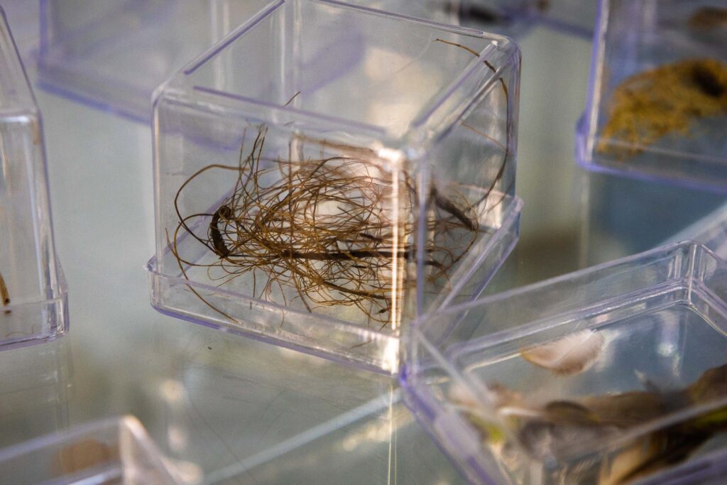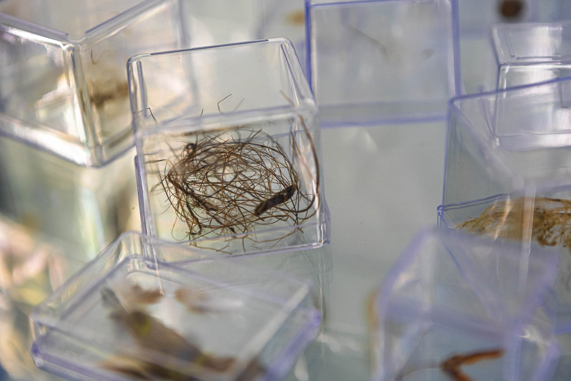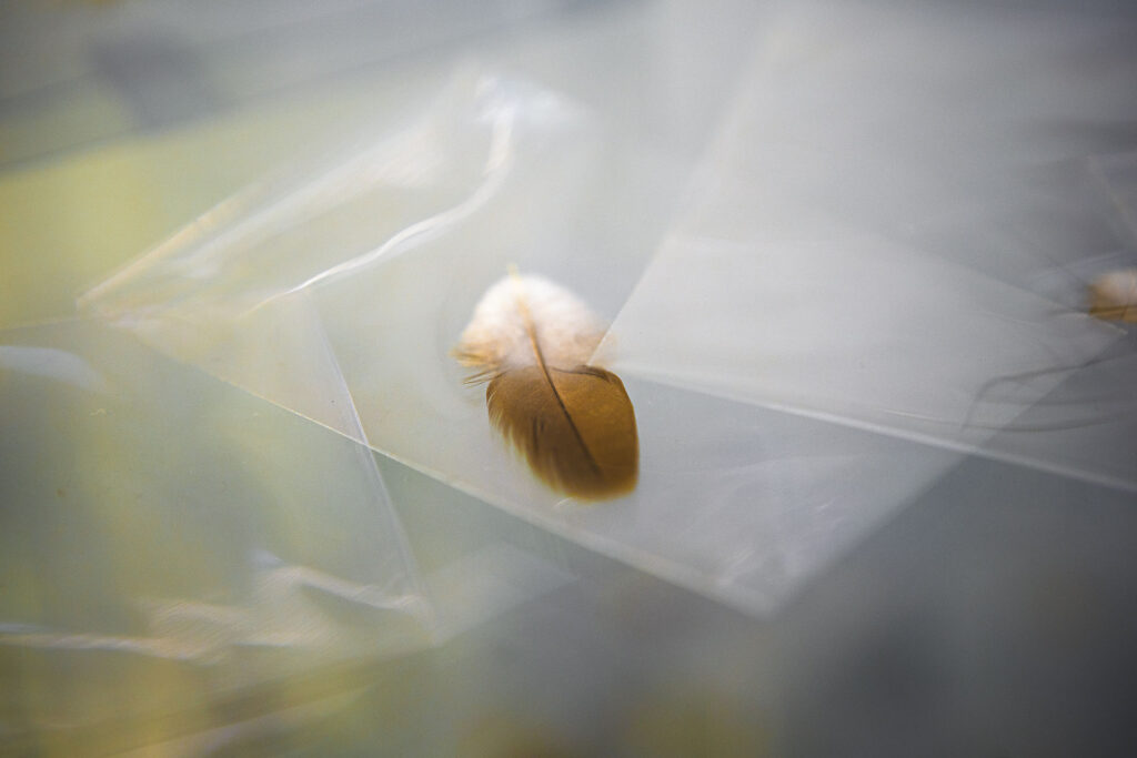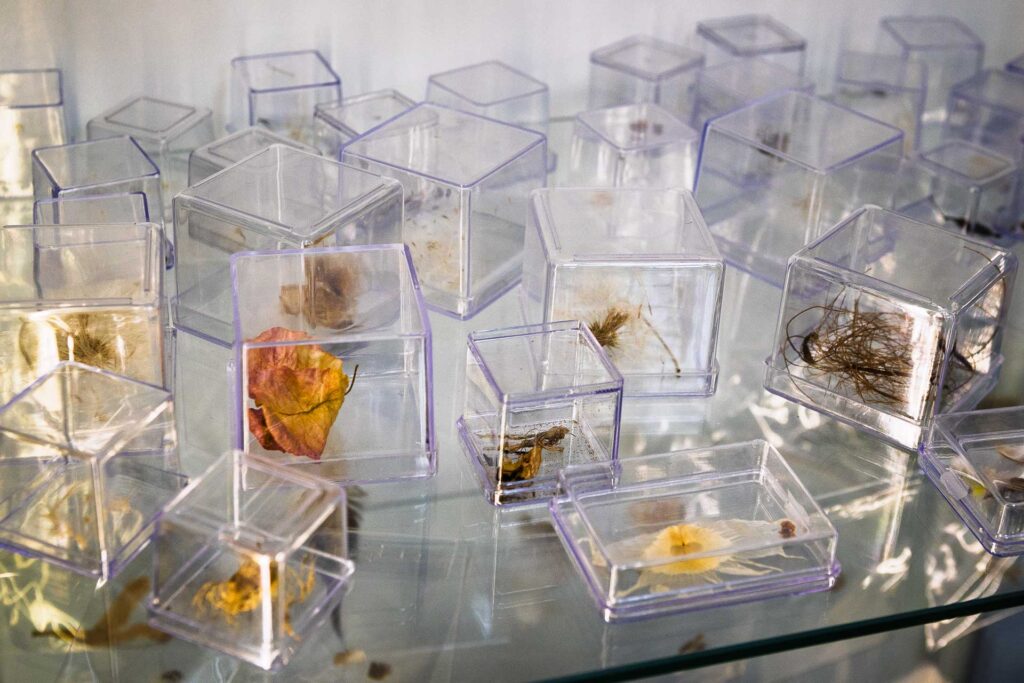 A captura teve início durante a pandemia, quando o vento parecia carregar as incertezas de um vírus nocivo. O tempo de isolamento despertou um novo cuidado no olhar. Laís passou a reparar no que o vento trazia junto à poeira e às folhas que se acumulavam na varanda de casa. Deixou de ver apenas o ato de varrer sujeiras para o lixo; percebeu ali uma forma de comunicação. E, como profissional da fala, soube escutar o sopro sutil dos acúmulos de penas, cipós, gravetos, pelos e pó. Diante dela, uma nova língua se revelava: um idioma sem palavras nem gramática, imaterial, que se abria trazendo presentes e sinais. Um companheiro sereno que acolhia e dialogava. Em Ventania, vemos o que a artista recolhe dessa conversa: a classificação, a separação e a elevação da desordem em gesto de organização.