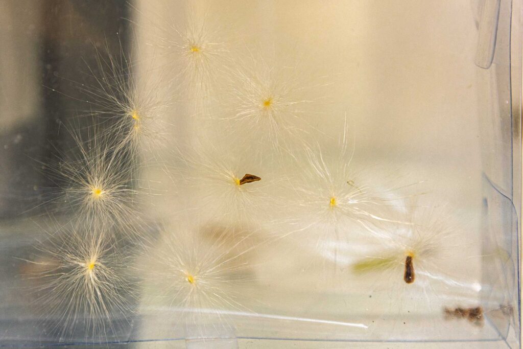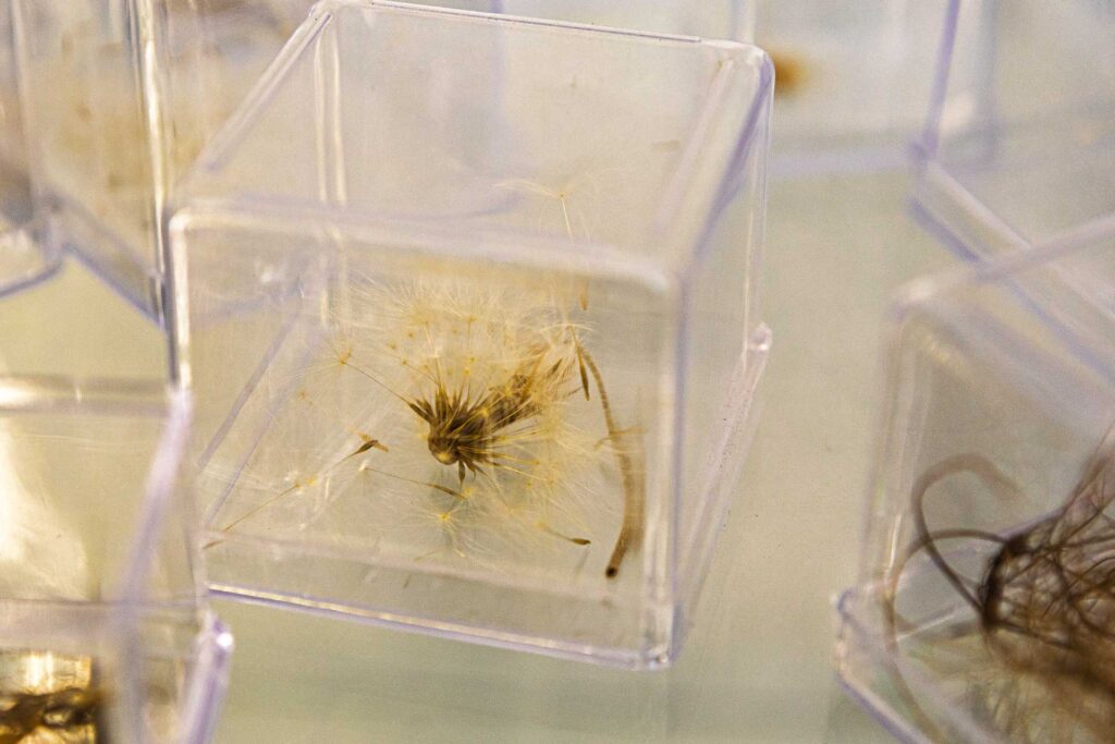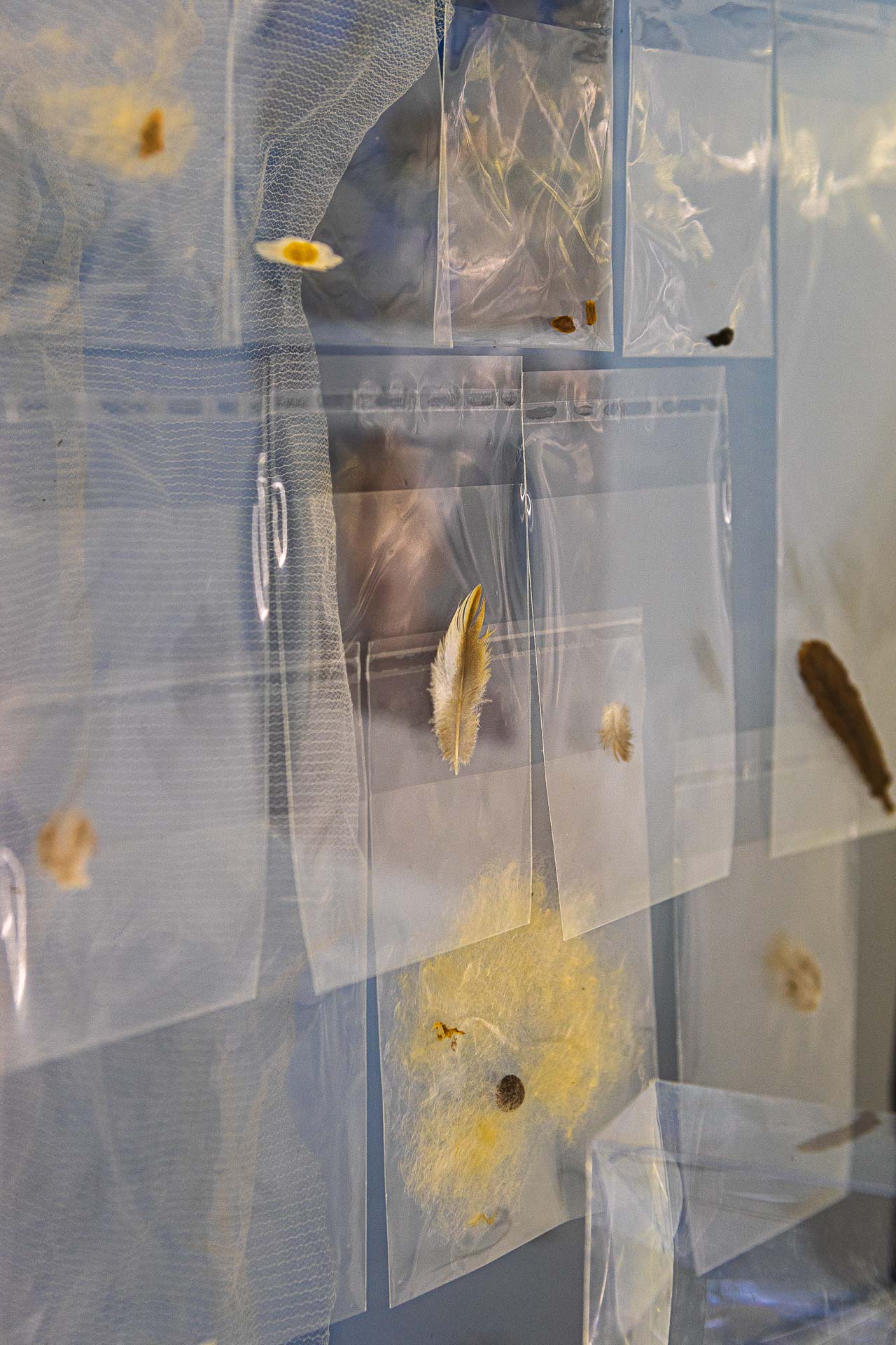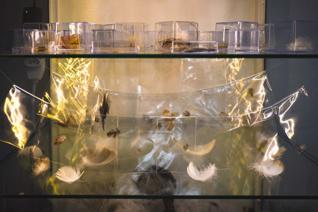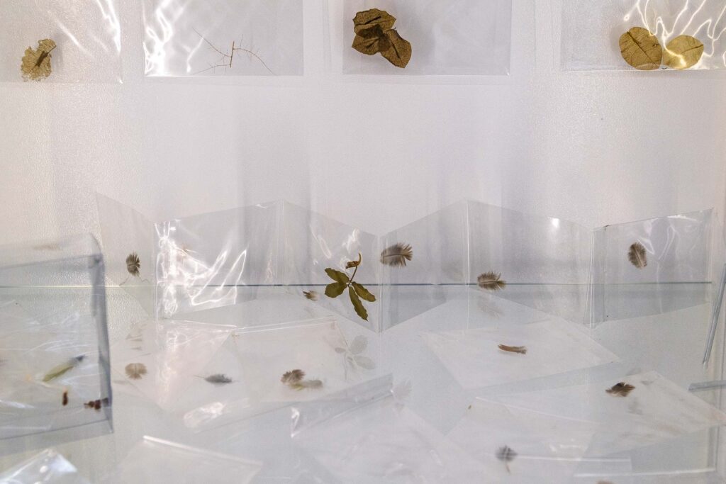 Assim como em A Odisseia, em que Éolo guarda em um odre os ventos que conduzem Ulisses em sua travessia, aqui o ar se faz guardado de outra forma: não em cordas ou velas, mas nos fragmentos que transporta. Cada folha, semente, pena ou resíduo leve, deslocado pela força invisível, é testemunho daquilo que Fernando Pessoa descreve como a vocação marítima e errante da alma, impulsionada por um sopro maior que si mesma. Manoel de Barros bem recorda — é no ínfimo que reside a grandeza de quem sabe contemplar as minúcias da natureza. O espaço da galeria torna-se, assim, um recipiente de passagens e sopros, um lugar em que a matéria leve da natureza encontra hospedagem.