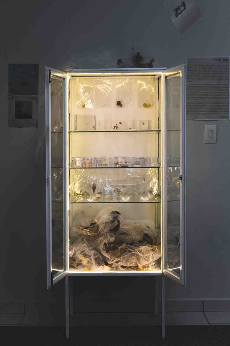 A exposição apresenta uma série de trabalhos feitos a partir de materiais trazidos pelo vento e coletados durante a pandemia. Se aquele momento carregava consigo o peso de uma pandemia vivida de proporções planetárias, a artista responde às trágicas notícias com uma inimaginada leveza e sensibilidade criativa. É como se tivesse construído um escudo para suportar a dor das perdas que atravessavam aqueles dias desesperadores e que se prolongaram ao longo de dois anos. Ventania tem sua exibição presencial na Galeria Momento, um espaço expositivo itinerante da Destempo, montada no hall da Biblioteca Central da UDESC entre 06 de setembro e 31 de outubro de 2025. Recebe agora sua versão virtual.